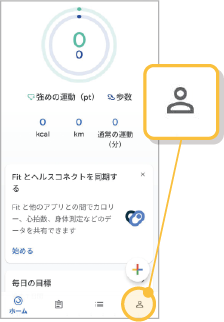 ❶Google Fitアプリを起動しトップ画面右下のメニューから「プロフィール 」をタップ